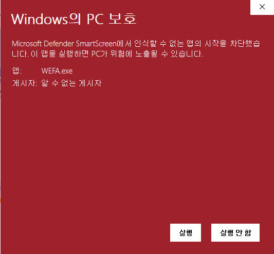 처음 실행하면 윈도우10 기준 다음처럼 경고 메시지가 뜨는데 무시하고 실행하면 된다.