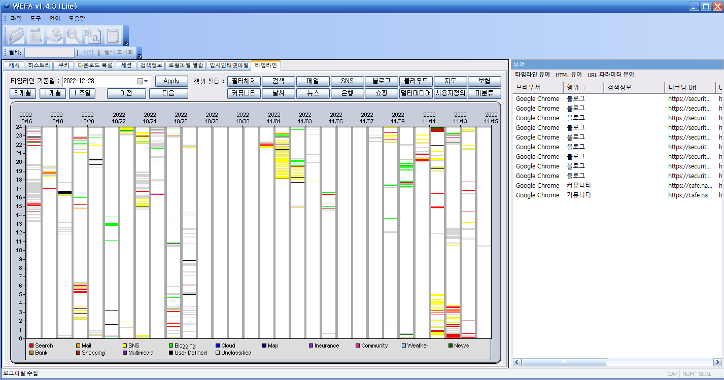 타임라인 분석 같은 경우에는 웹 브라우저로 무슨 일을 했는지 자동으로 행위를 분류해서 집계해준다.