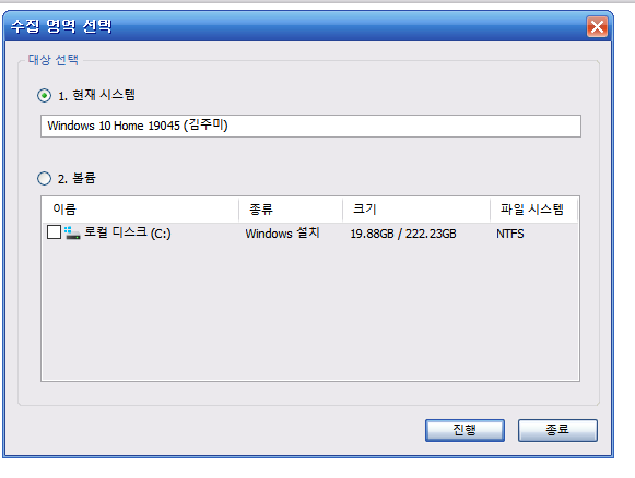 마찬가지로 메뉴 탭이나 아이콘을 클릭해서 실행할 수 있고 현재 시스템이나 드라이브를 선택해서 수집할 수 있다.