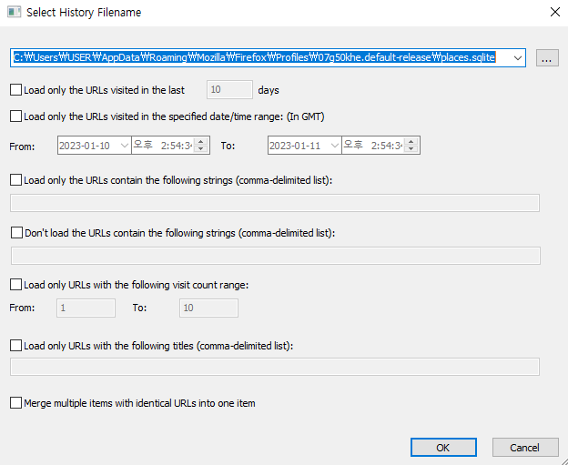 처음 툴을 실행하면 다음처럼 아티팩트 분석을 위해 조건들을 지정하는 창이 뜬다. firefox의 경우 Chrome과 동일하게 sqlite database 파일에 웹 아티팩트 정보가 저장되어 있었다. 상단에 자동으로 잡히는 경로가 해당 데이터베이스의 경로이다.
