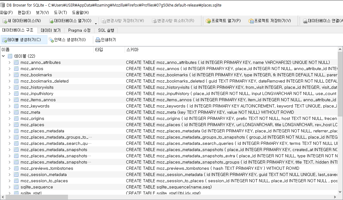 DB Browser로 간단하게 오픈이 가능하다. moz_places 테이블의 정보들을 재조립해서 표시하는 방식인듯...